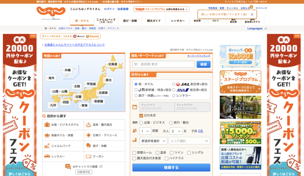 - 長所: じゃらん限定の「訳ありプラン」や「直前割」が充実。Pontaポイントやdポイントが貯まります。