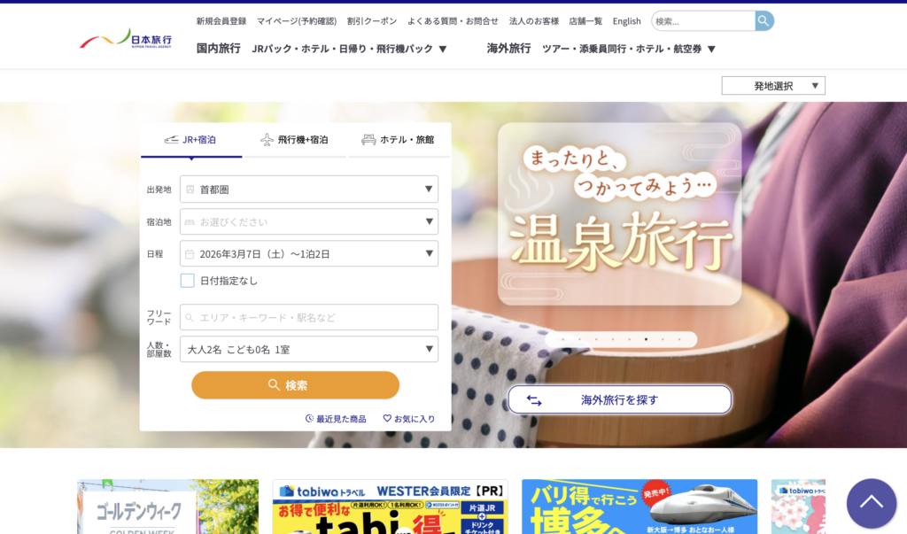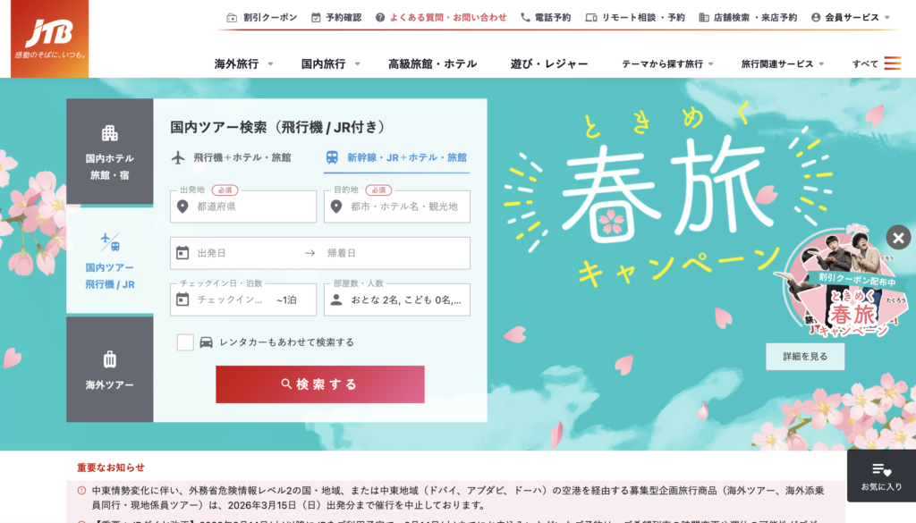 - 長所: 実店舗がある安心感と、大手ならではの宿泊枠の確保。繁忙期でもJTBなら空室があることも。