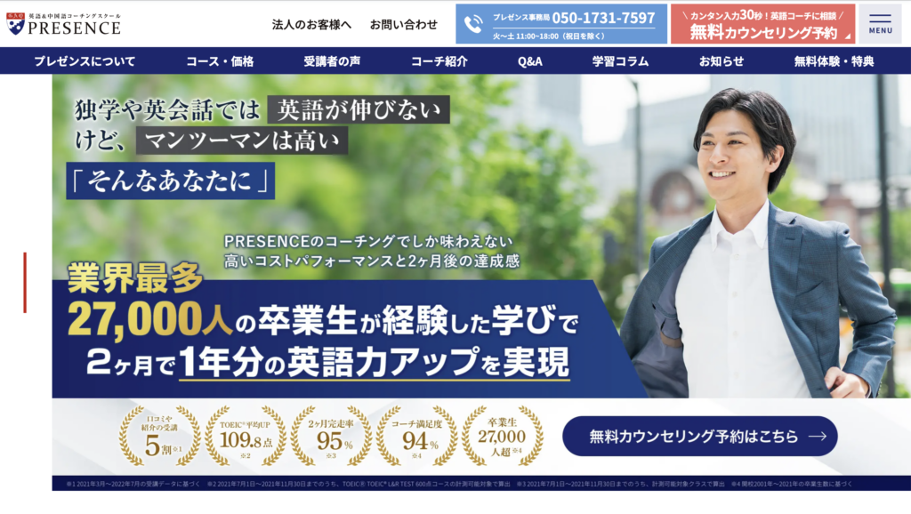- 特徴: ベネッセグループが運営。大学・大学院で言語学を学んだ「専門家」がコーチ。