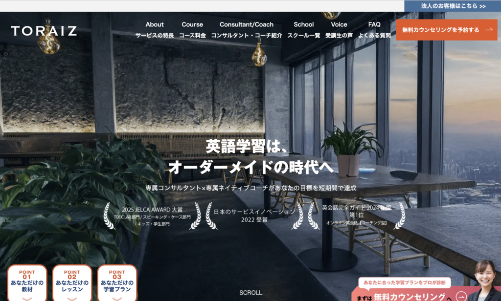 | 4位 | トライズ (TORAIZ) | 12ヶ月 | 約134万円 | 1年で1,000時間。ネイティブ講師とのレッスン付 |