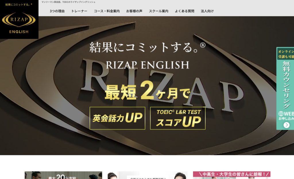 | 6位 | ライザップイングリッシュ | 2〜3ヶ月 | 約41万〜63万円 | 「結果にコミット」。圧倒的なアウトプット矯正 |