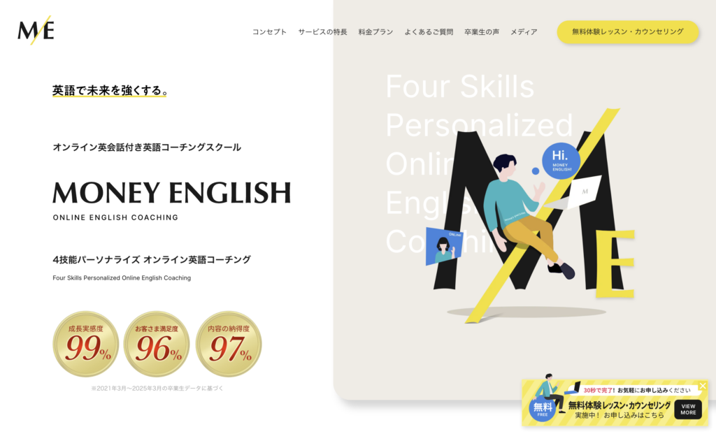 | 8位 | マネーイングリッシュ | 1ヶ月〜 | 約5.4万円/月 | リーズナブルな月額制。4技能を網羅 |