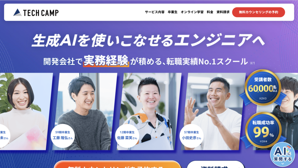 • 特徴: 未経験からの転職実績に定評があるテックキャンプ。2026年、カリキュラムを一新し「AIを駆使したチーム開発」を標準搭載。