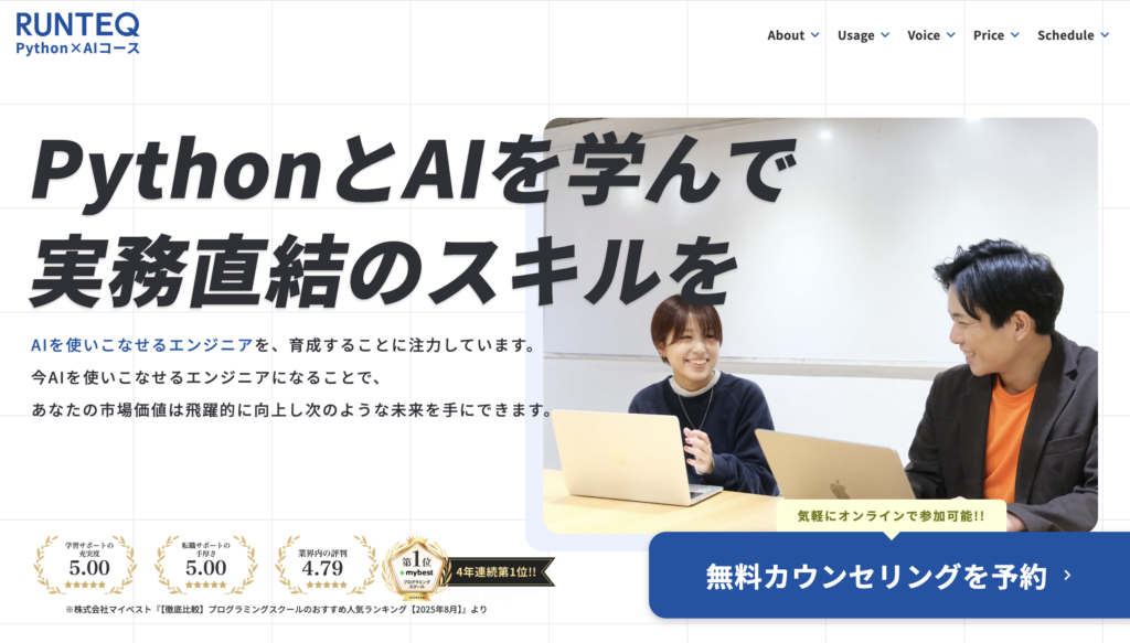 • 特徴: 「Webエンジニアとしての圧倒的な実装力」を鍛えることで知られるRUNTEQ。2026年現在は、開発工程のあらゆる場面でAIを活用する「Python×AIコース」が非常に強力です。