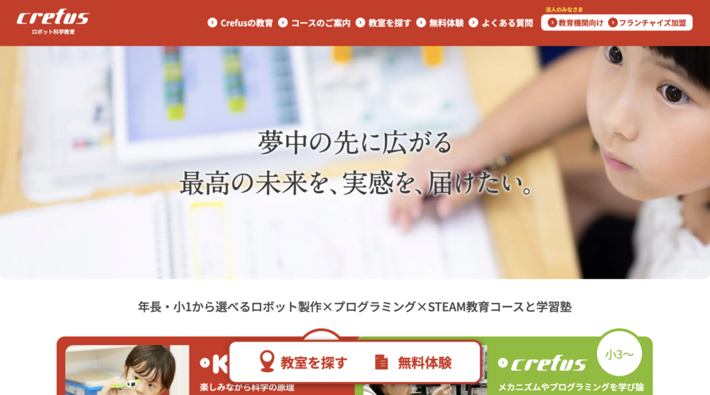 | 9位 | Crefus (クレファス) | 通学/オンライン | 約8,250円〜 | 理数系に強くなるロボット科学教育 |