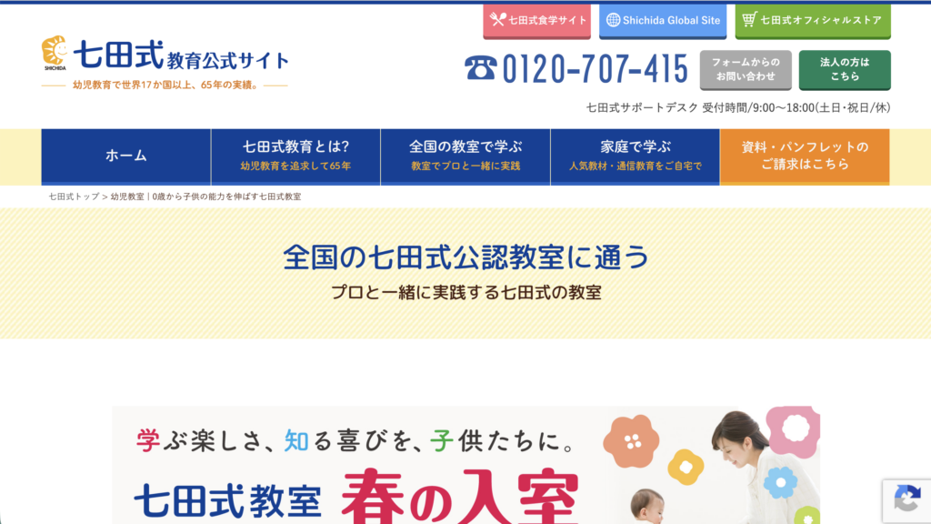 - ポイント: 2026年3月〜6月にかけて「春の入室キャンペーン」として入室金無料を実施中。家庭学習用プリント「七田式プリント」との併用が最強です。