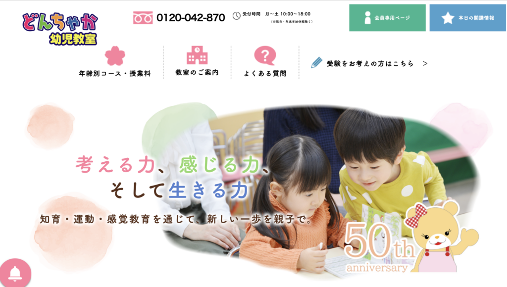 | 7位 | どんちゃか幼児教室 | 五感教育・少人数制 | 0歳6ヶ月〜 | 約11,000円〜 |