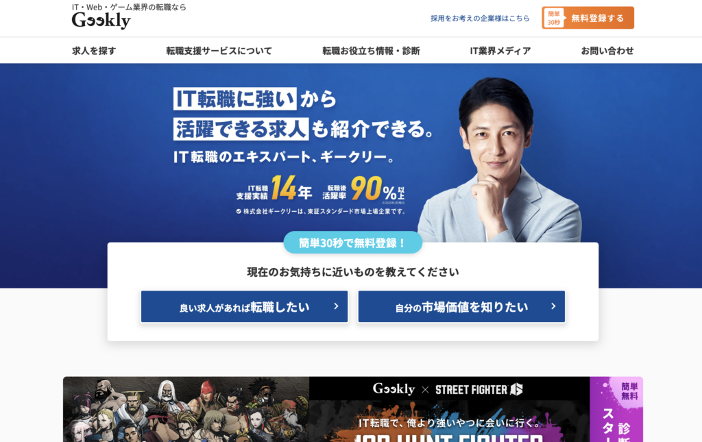 1位ギークリーIT・Web・ゲーム約30,000件以上高速マッチングと年収アップ交渉に強み