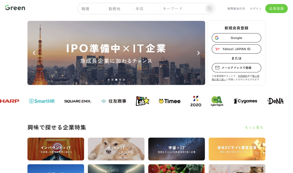 10位Green (グリーン)IT・ベンチャー約30,000件以上カジュアル面談が豊富。自分から探すサイト型