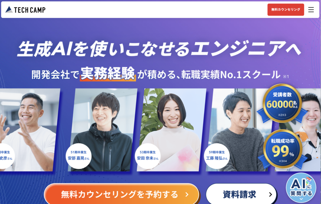 TECH CAMPRuby / AI60万円〜圧倒的な知名度。AI活用スキルも学べる