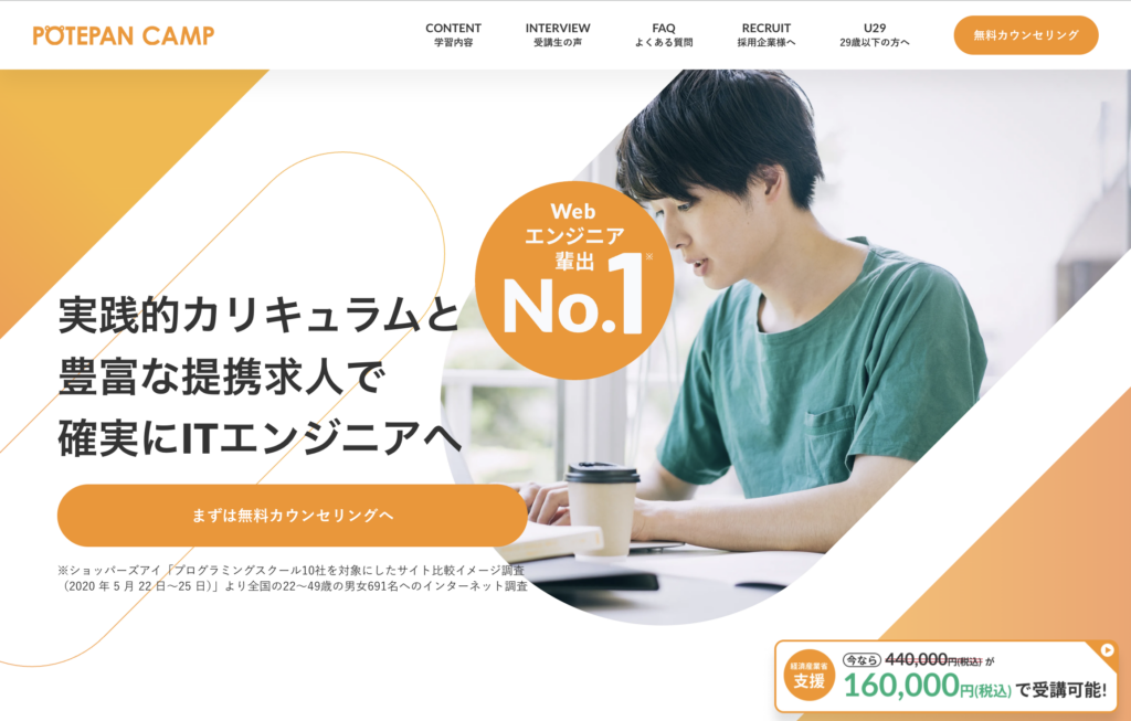 ポテパンキャンプRuby on Rails約44万円自社開発企業への転職に特化。選抜制の厳しさ