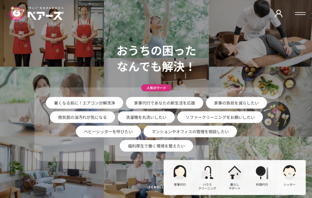 | ベアーズ (Bears) | 家事全般 | 1回 9,900円〜 | 業界最大手。ホスピタリティ溢れる高品質指導 |