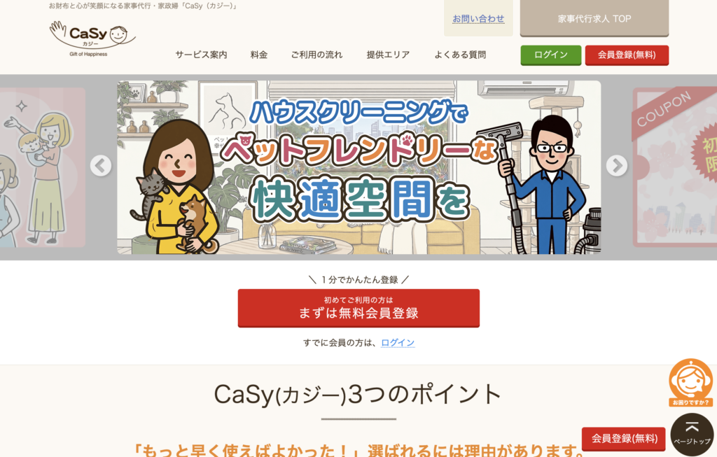 | CaSy (カジー) | 掃除・料理 | 1時間 2,900円〜 | アプリで即予約。低価格で日常使いに最適 |