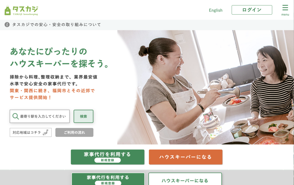| タスカジ | 掃除・料理 | 1時間 1,500円〜 | 個人間マッチング。料理の作り置きに強い |