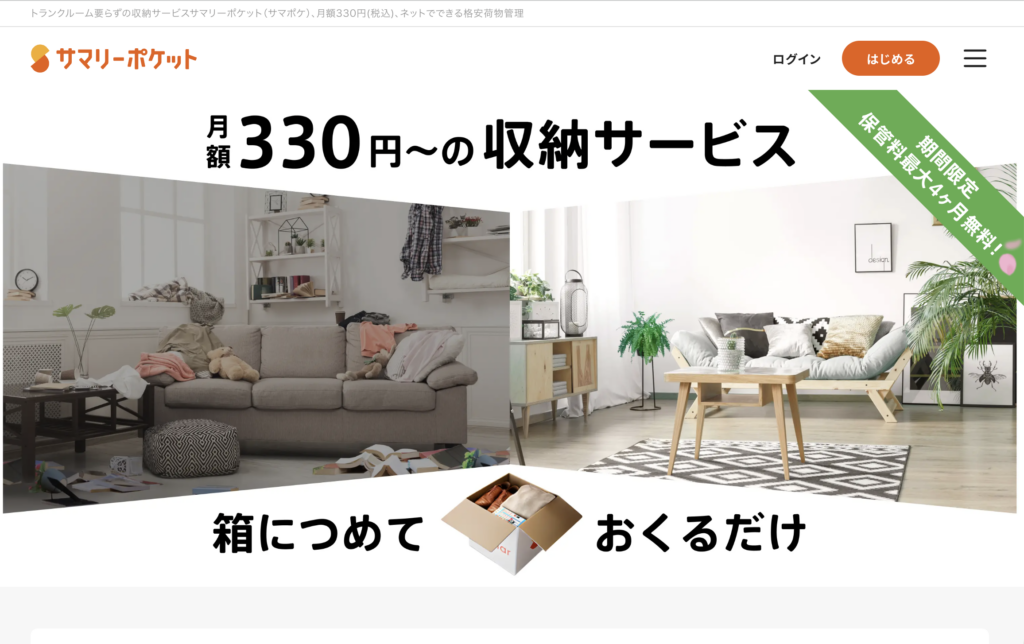 | サマリーポケット | 宅配収納 | 月額 330円〜 | 荷物を預けて部屋スッキリ。クリーニングも可 |