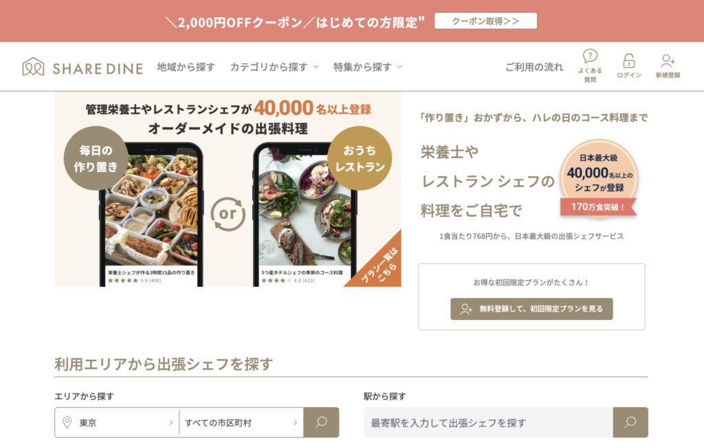 | シェアダイン | 料理特化 | 1回 10,000円〜 | 専門シェフが自宅で調理。栄養管理も万全 |