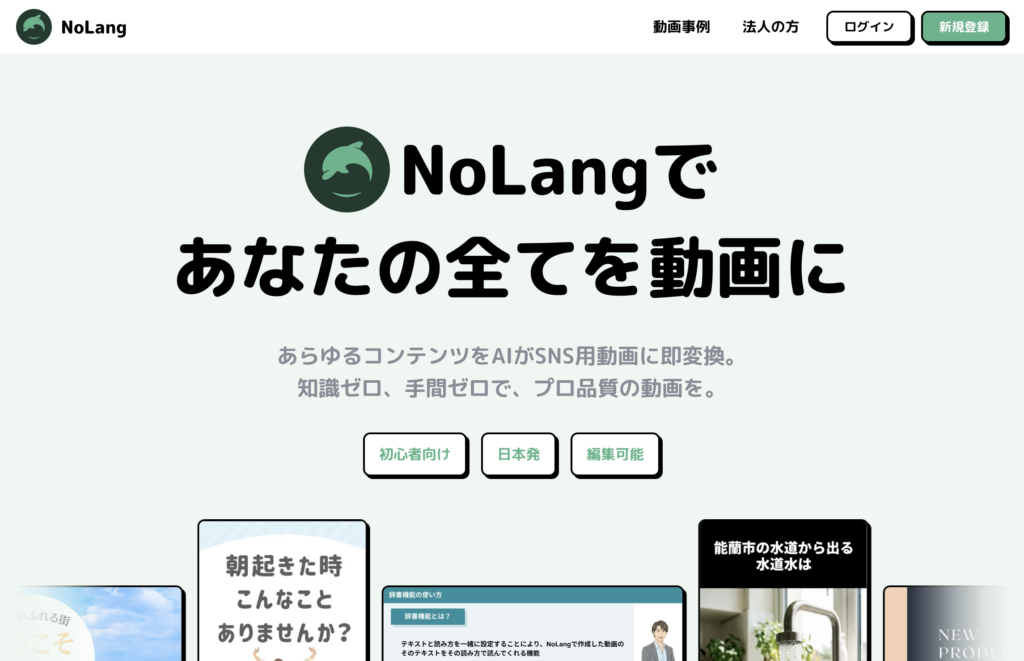 NoLang短尺動画生成情報を「一瞬で」動画化。解説・広報に最強基本無料