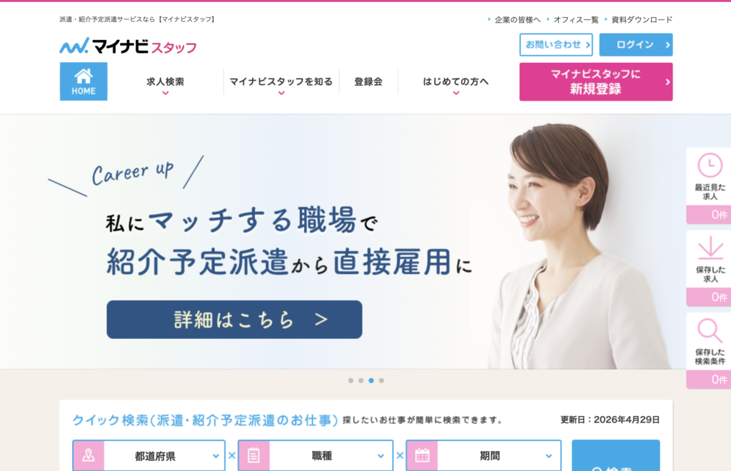 • 特徴: マイナビの正社員(無期雇用派遣)として、厳選された大手・優良企業で働けます。2026年4月からは給与水準が大幅にアップし、対象エリアも拡大。就業前後の研修が非常に手厚く、PC操作に自信がない人でも安心してスタートできます。